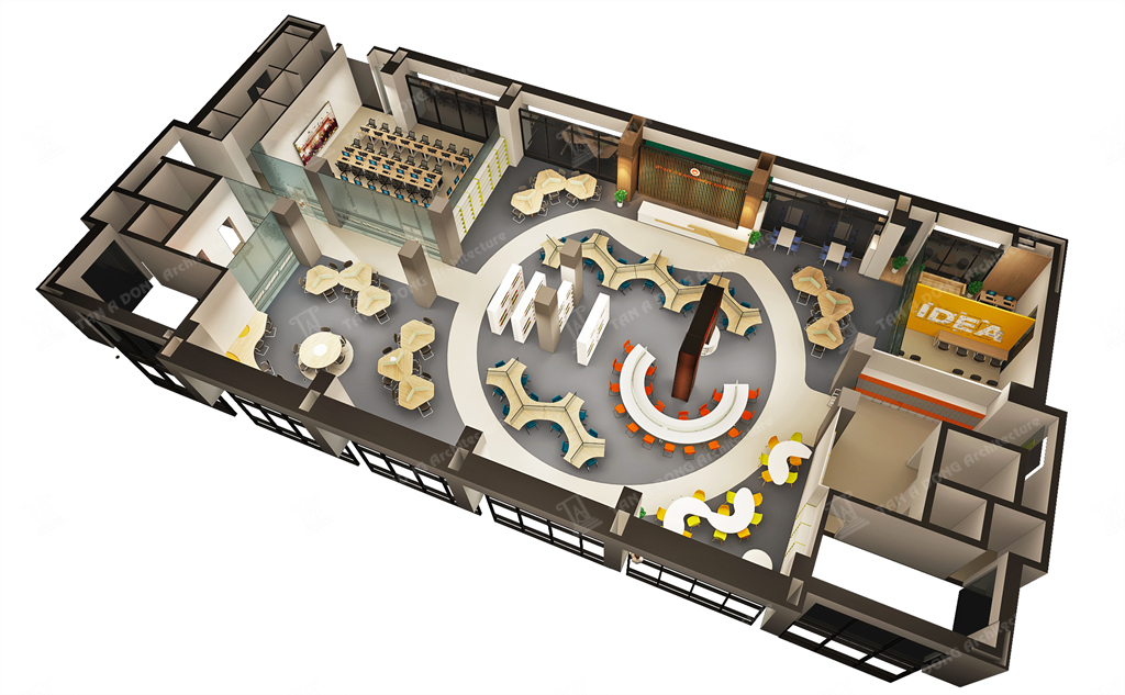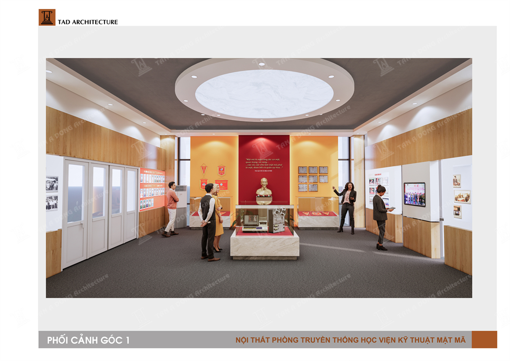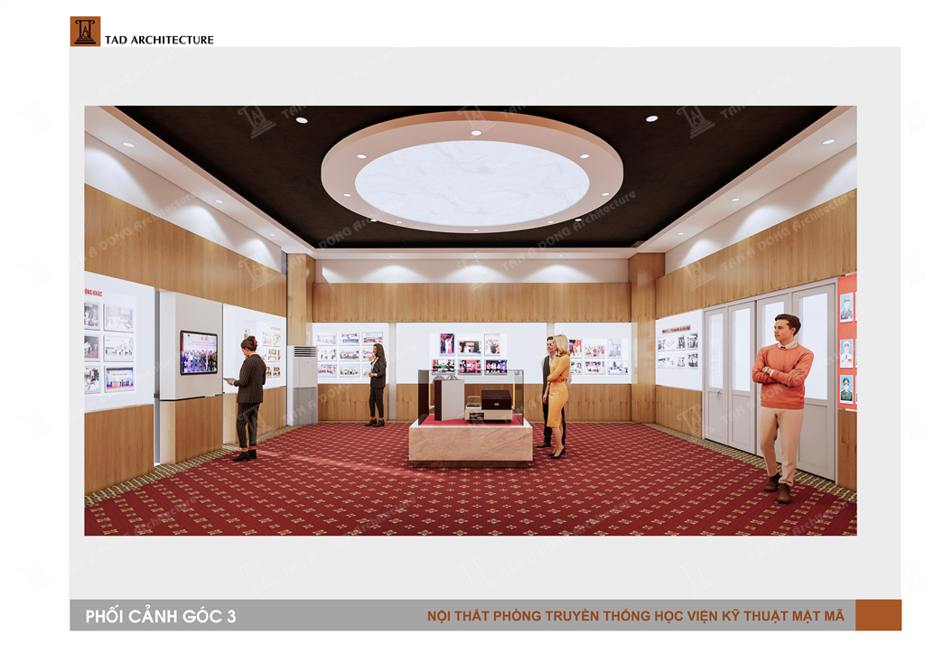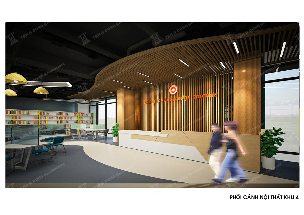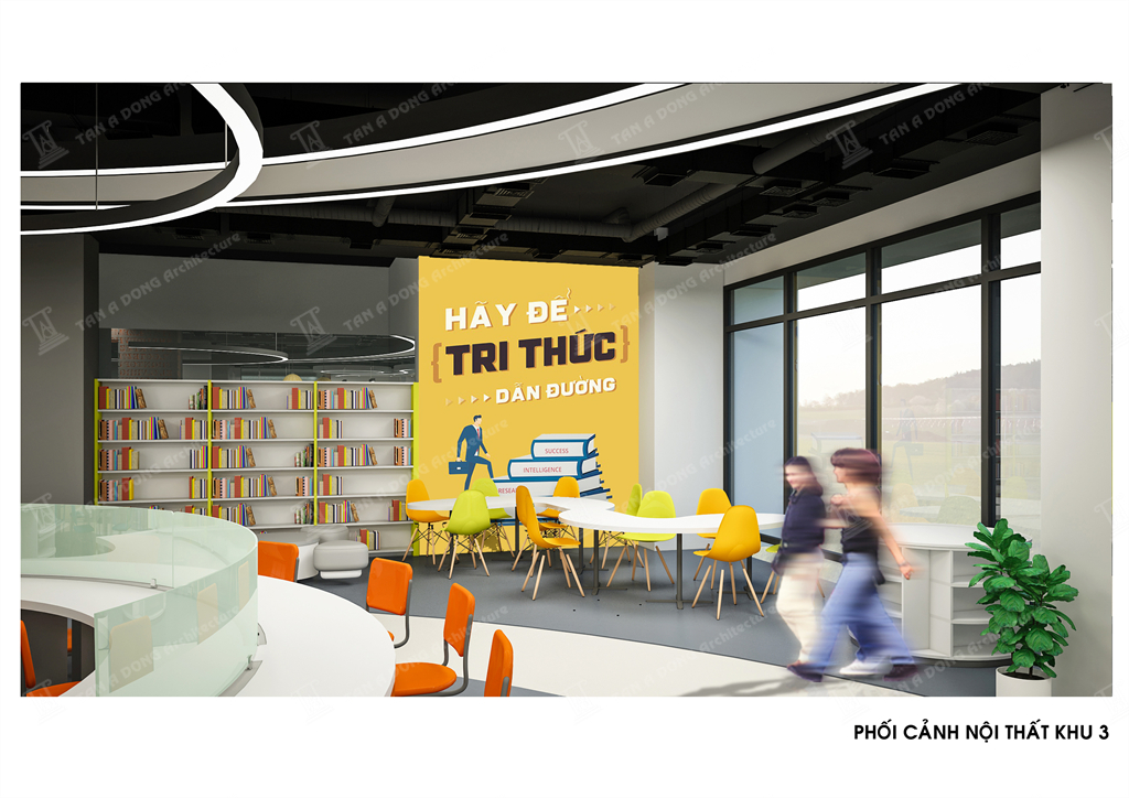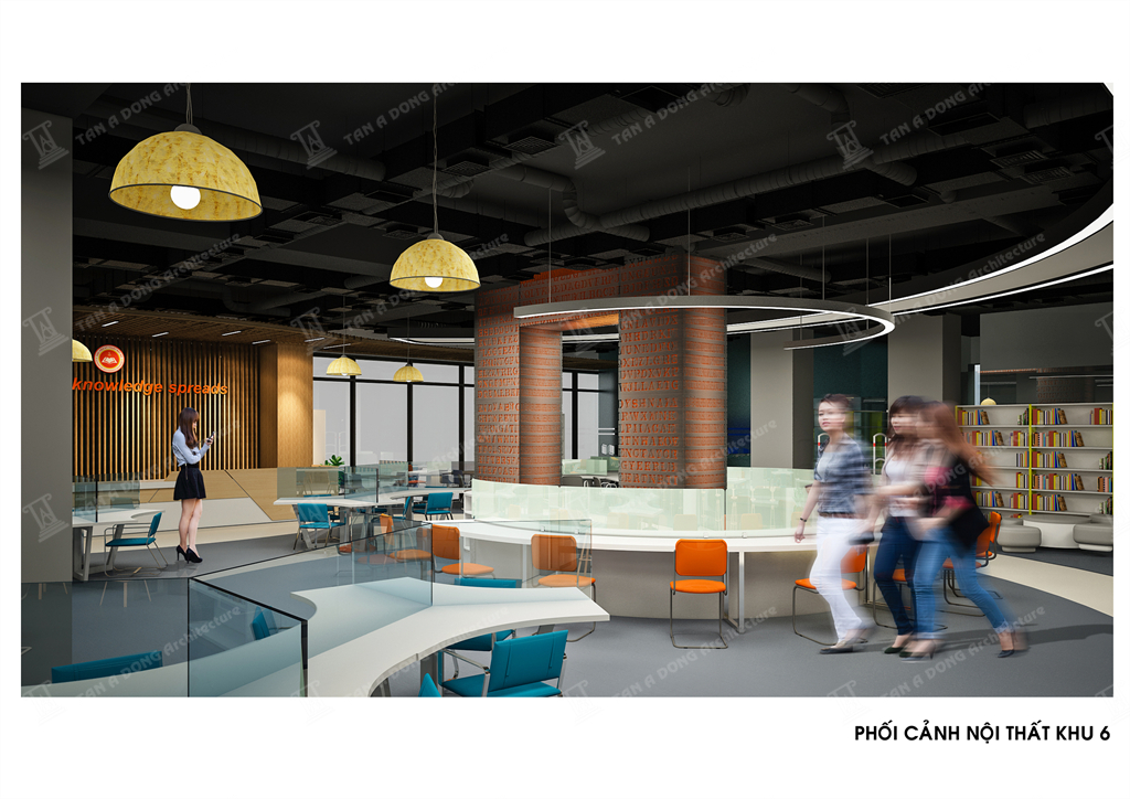 Bốc cục không gian đọc dạng mở, các khu chức năng đọc được bố cục tập trung hay phân tán trên mặt bằng để đảm bảo công năng tố ưu nhất,Các cụm bàn ghế đọc đa dạng trên việc bố trí chính phụ, có điểm nhấn. Trần theo hình tròn của sàn ở vị trí trung tâm có hình chiếc chìa khóa để tạo sự liên tưởng thú vị tới logo của học viện, các cột cải tạo được kết nối và tạo mảng, cột chính được thiết kế dạng sắt sơn hiệu ứng có các chữ cái đục CNC kiểu các chữ cái mật mã. Không gian toát lên tính hiện đại , năng động và có bản sắc riêng của học viện.
